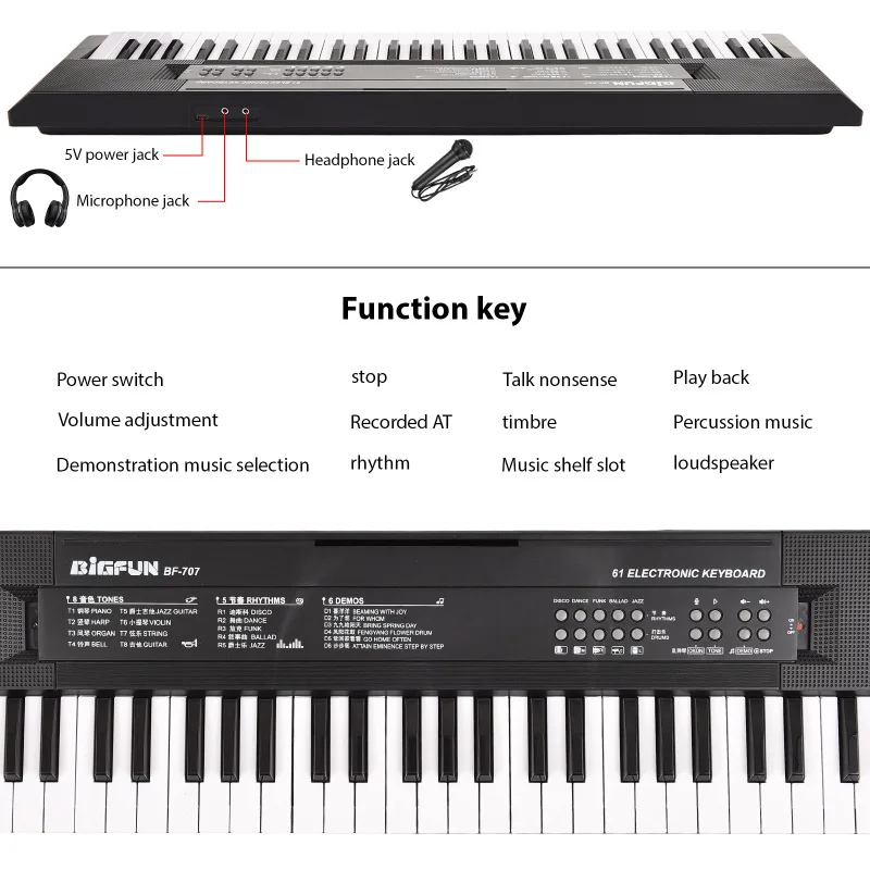 BIGFUN 61 Key Electronic Keyboard Piano Dual Speaker 8 Tone 5 Rhythm 5 Drums Percussion 6 Demo Musical Instrument with Mic