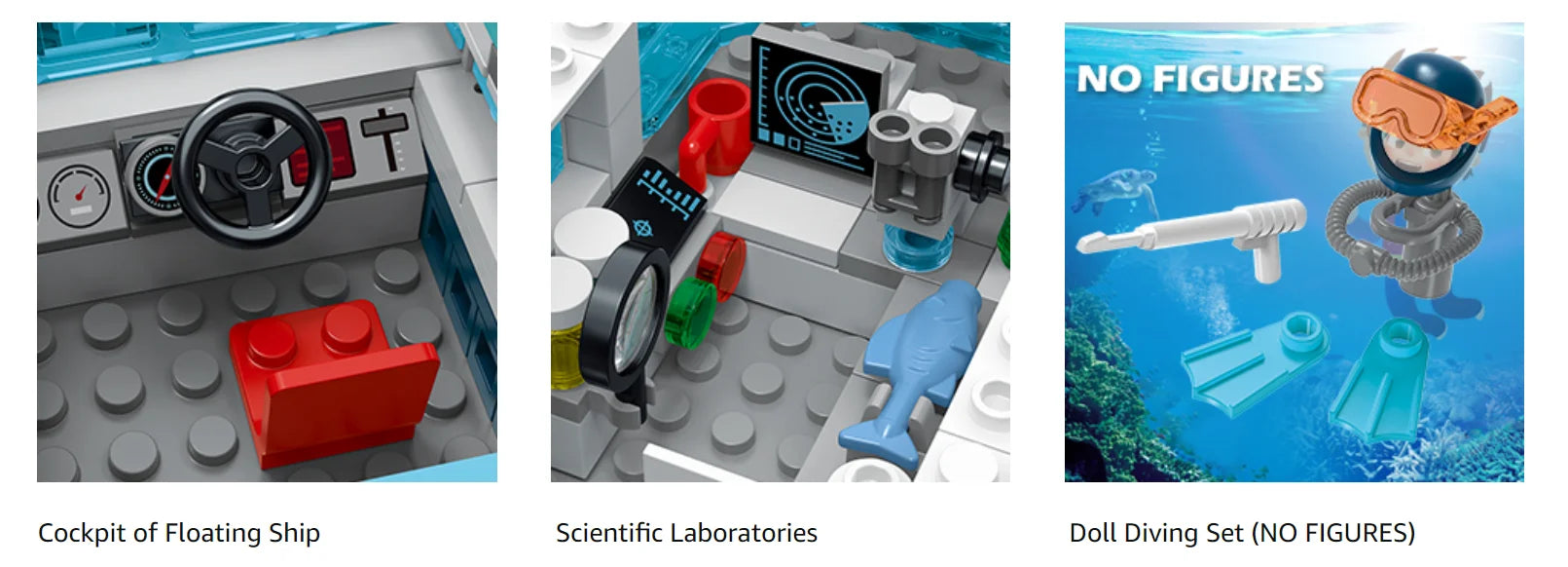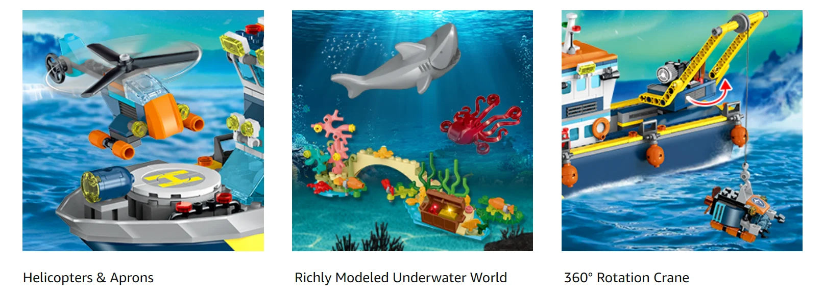RICH ADVENTURE DETAILS: This floating exploration boat building kit boasts an impressive design, packed with intricate details and interactive features, comes with a working crane, shark cage, submarine and helicopter, along with models of sharks, cuttlefish, marine coral reefs, and underwater gifts. Children can easily dismantle the cabin's roof and second floor to explore the cockpit and laboratory interiors, immerse themselves in ocean exploration to create their own wonder world.