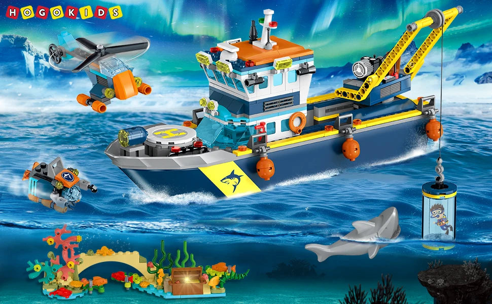HOGOKIDS Arctic Explorer Technic Ship Building Block Set with LED Light Ocean Exploration Helicopter Sub Shark for Kids Ages 6+